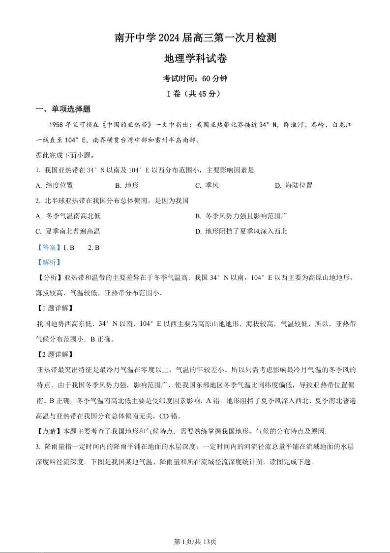 天津市南开中学2024届高三上学期第一次月考地理(精品解析版)