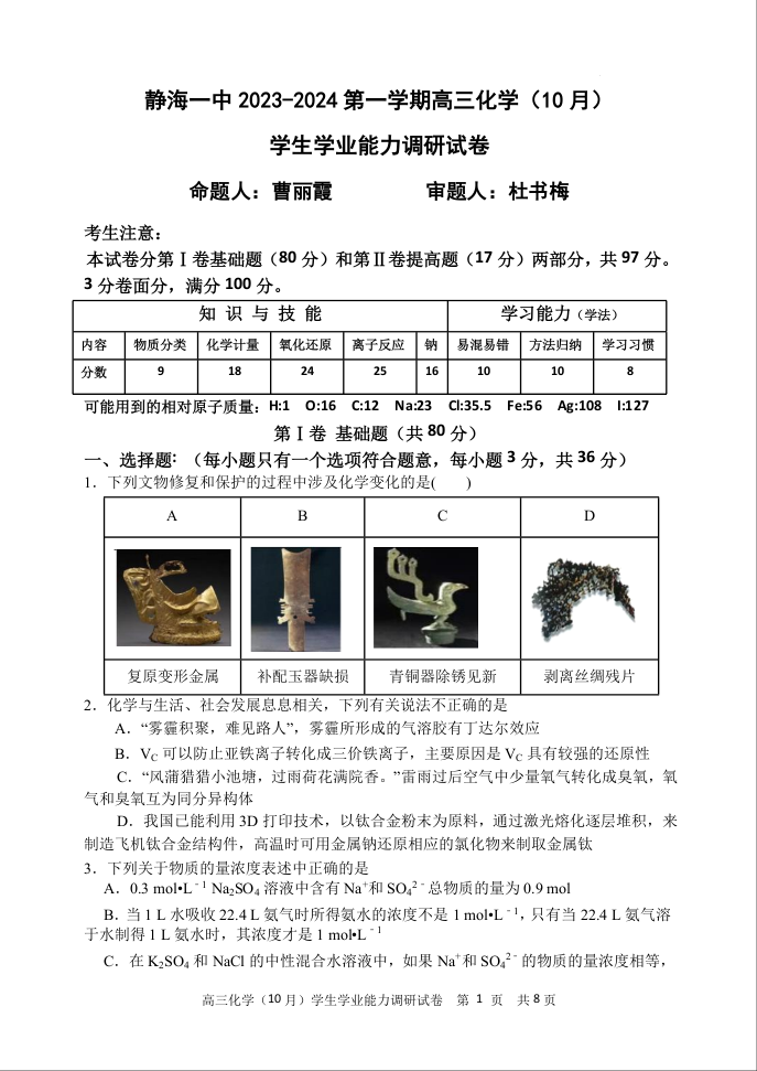 天津市静海区第一中学2024届高三上学期10月月考化学+答案