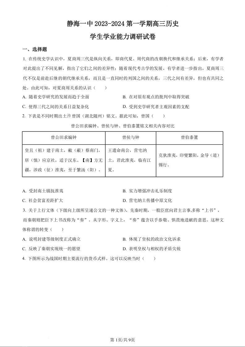 天津市静海区第一中学2024届高三上学期10月月考历史(原卷版)
