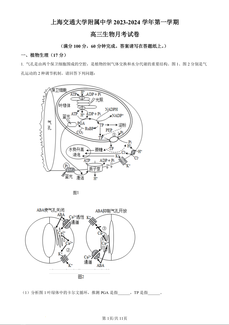 上海交大附中2024届高三上学期10月月考生物+答案