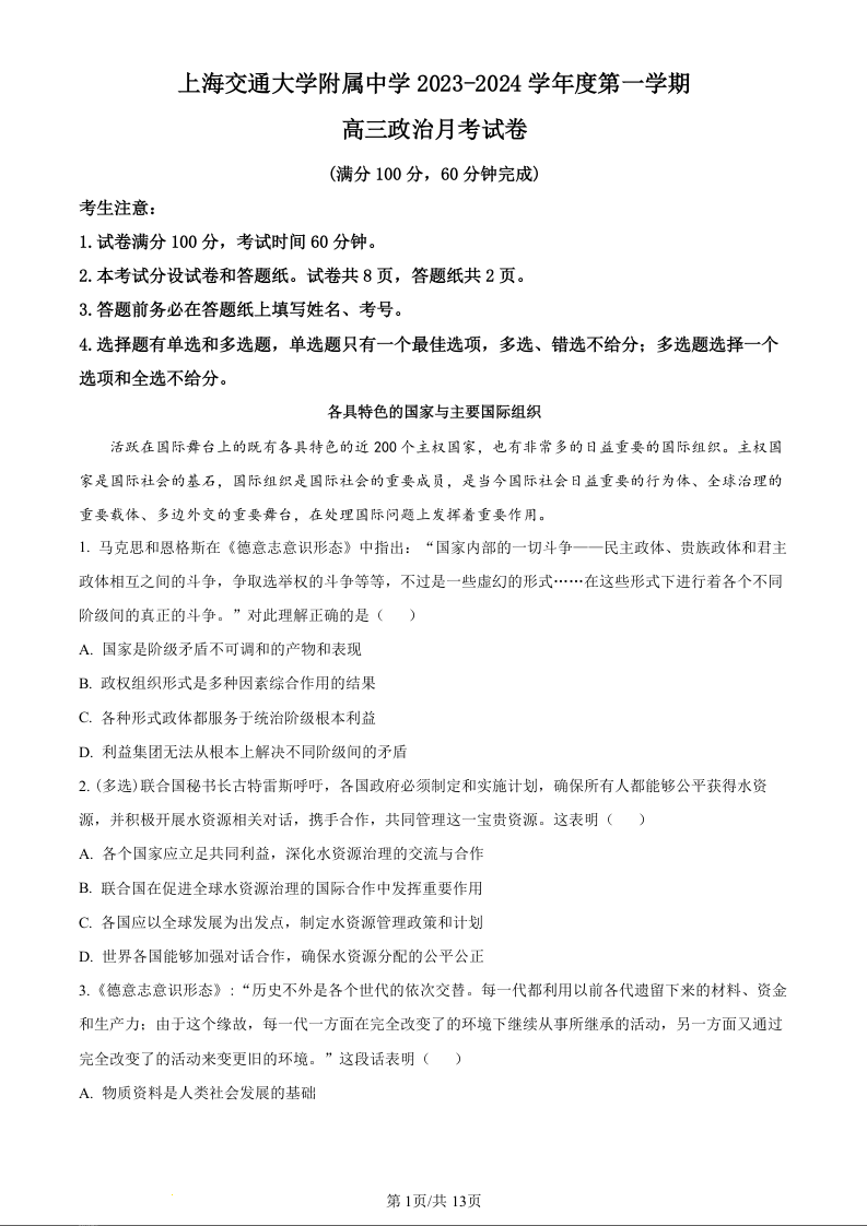 上海交大附中2024届高三上学期10月月考政治+答案