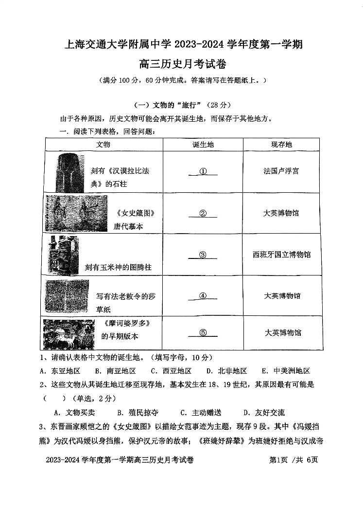上海交大附中2024届高三上学期10月月考历史