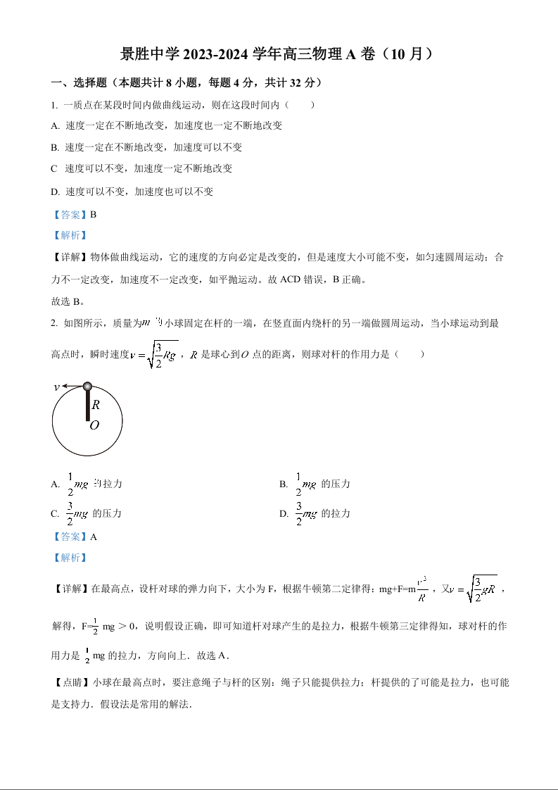 山西省运城市景胜学校(东校区)2024届高三上学期10月月考(A)卷物理(解析版)