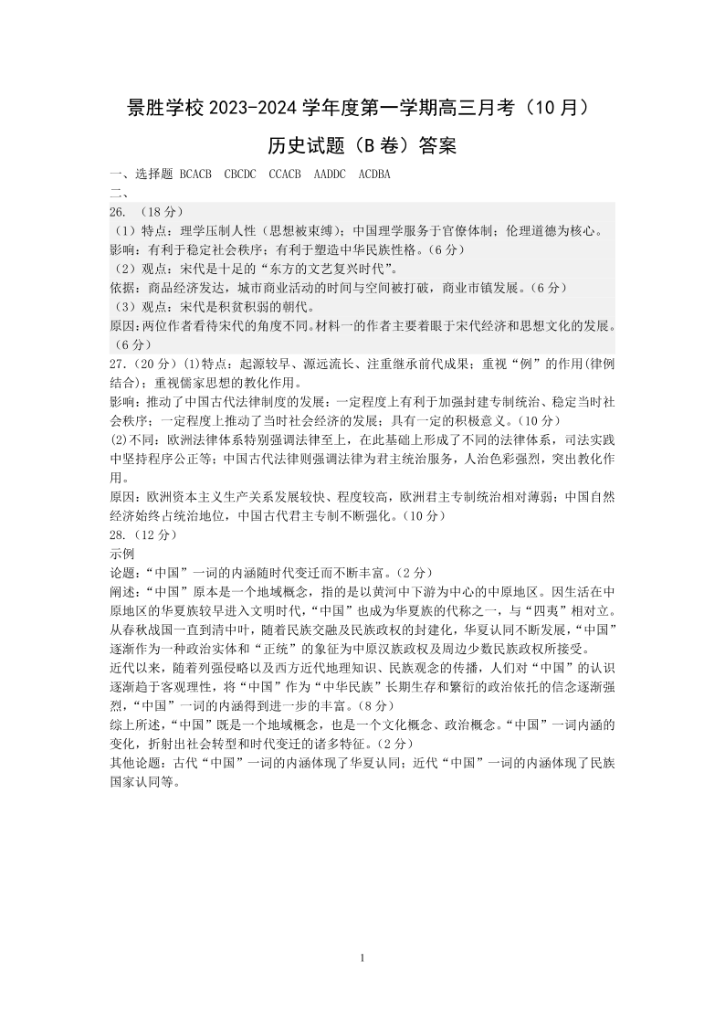 山西省运城市景胜学校(东校区)2024届高三上学期10月月考(B)卷历史答案