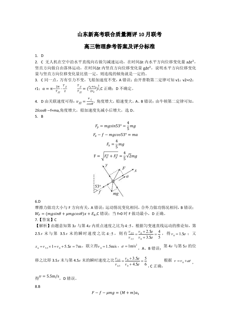 山东新高考联合质量测评2024届高三10月联考物理答案