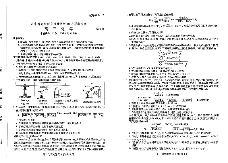山东新高考联合质量测评2024届高三10月联考化学