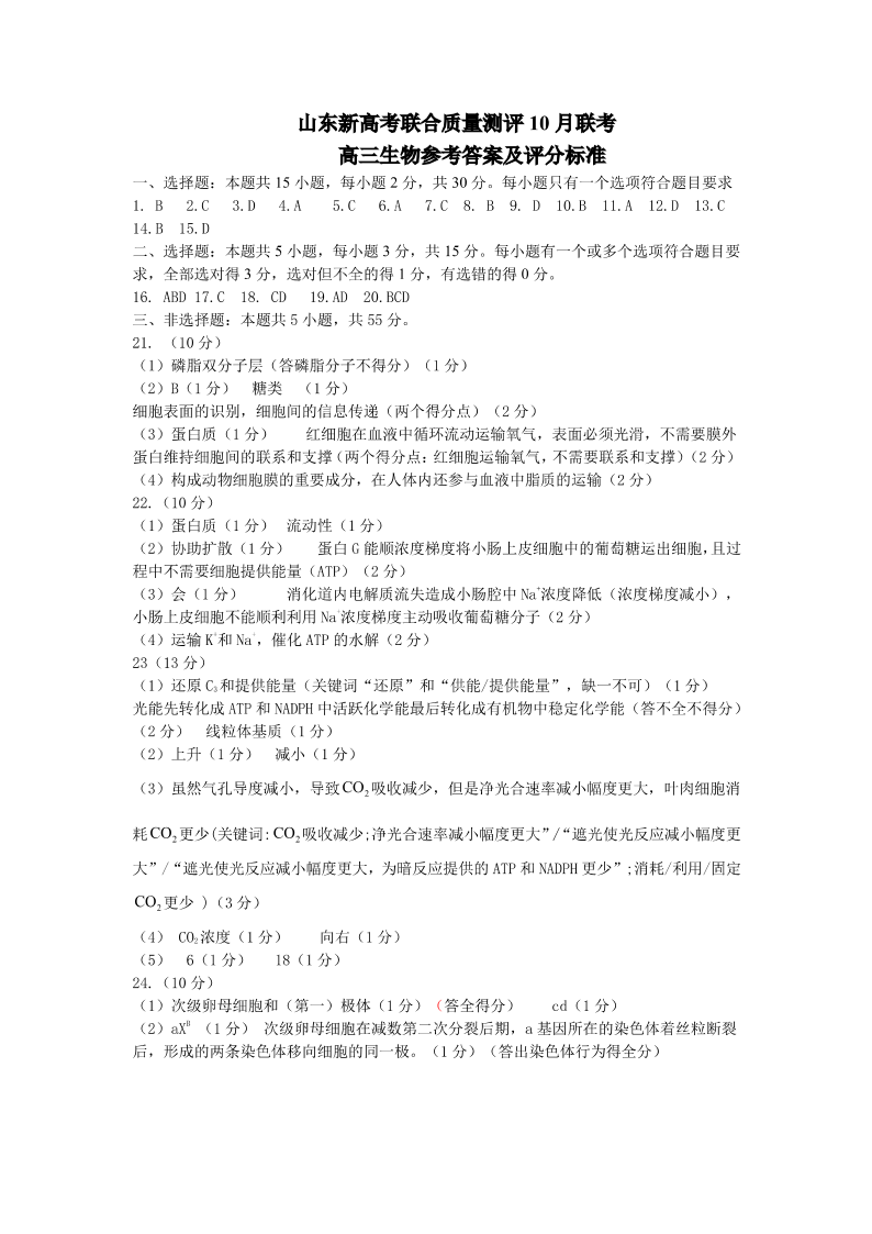 山东新高考联合质量测评2024届高三10月联考生物答案