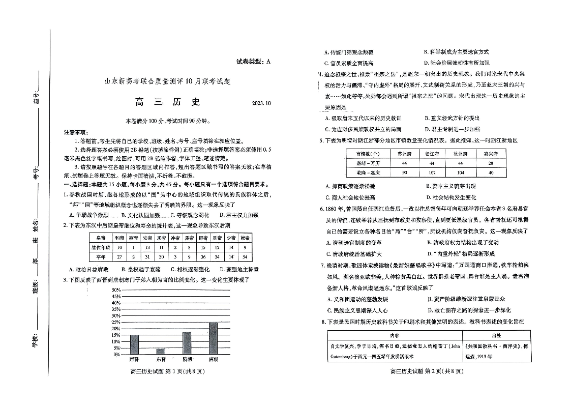 山东新高考联合质量测评2024届高三10月联考历史
