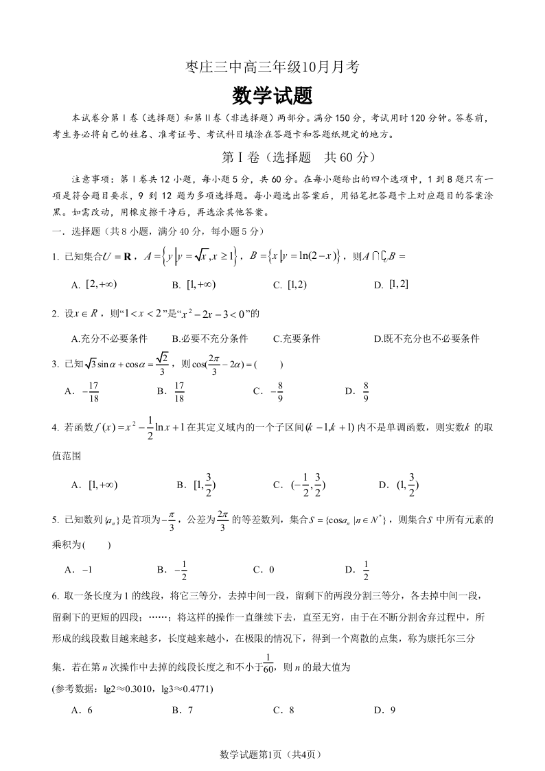 山东省枣庄市第三中学2024届高三上学期10月月考数学+答案