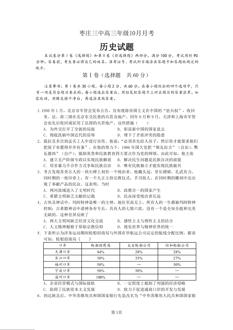 山东省枣庄市第三中学2024届高三上学期10月月考历史+答案