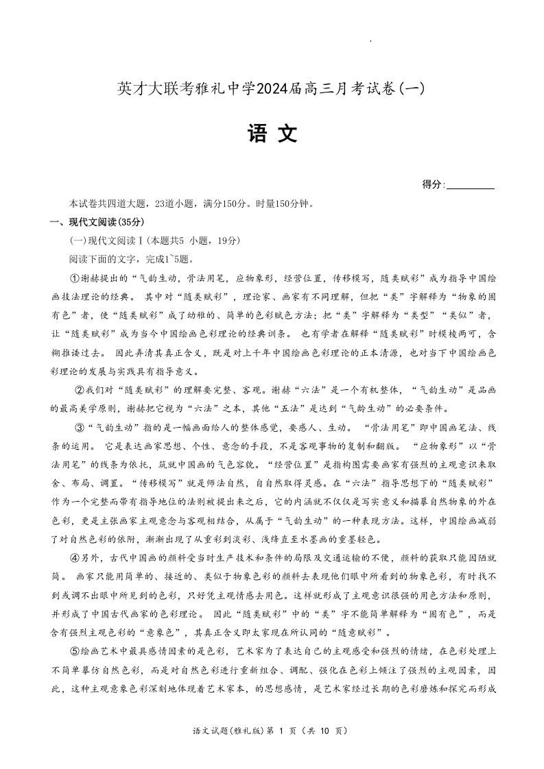 湖南省长沙市雅礼中学2024届高三上学期月考(一)语文