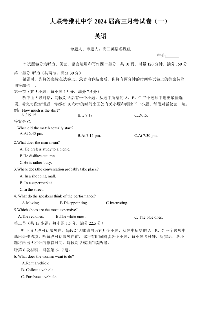 湖南省长沙市雅礼中学2024届高三上学期月考(一)英语