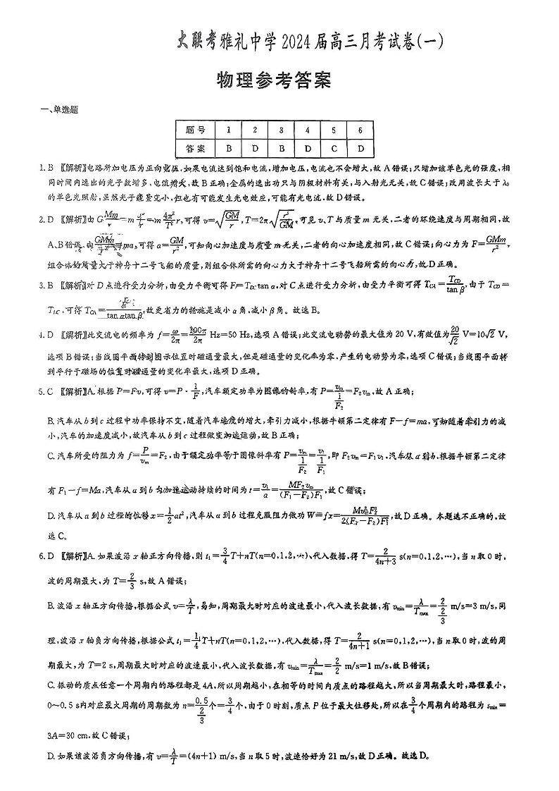 湖南省长沙市雅礼中学2024届高三上学期月考(一)物理答案
