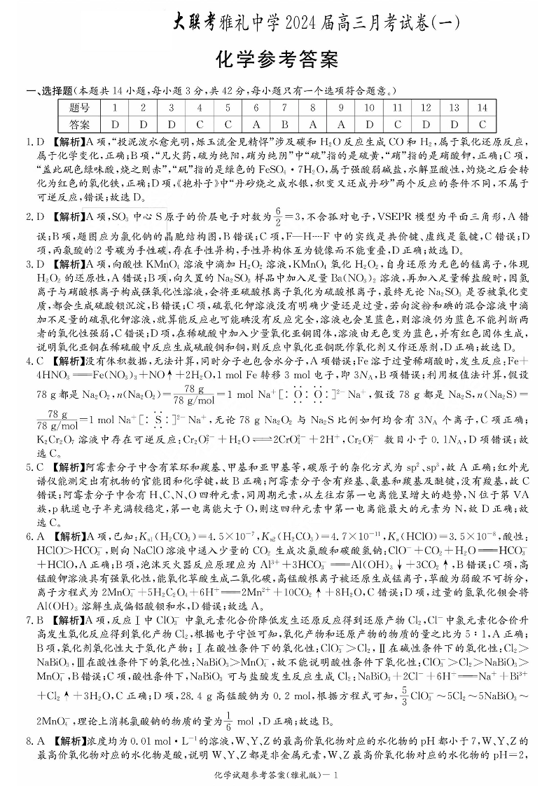 湖南省长沙市雅礼中学2024届高三上学期月考(一)化学答案