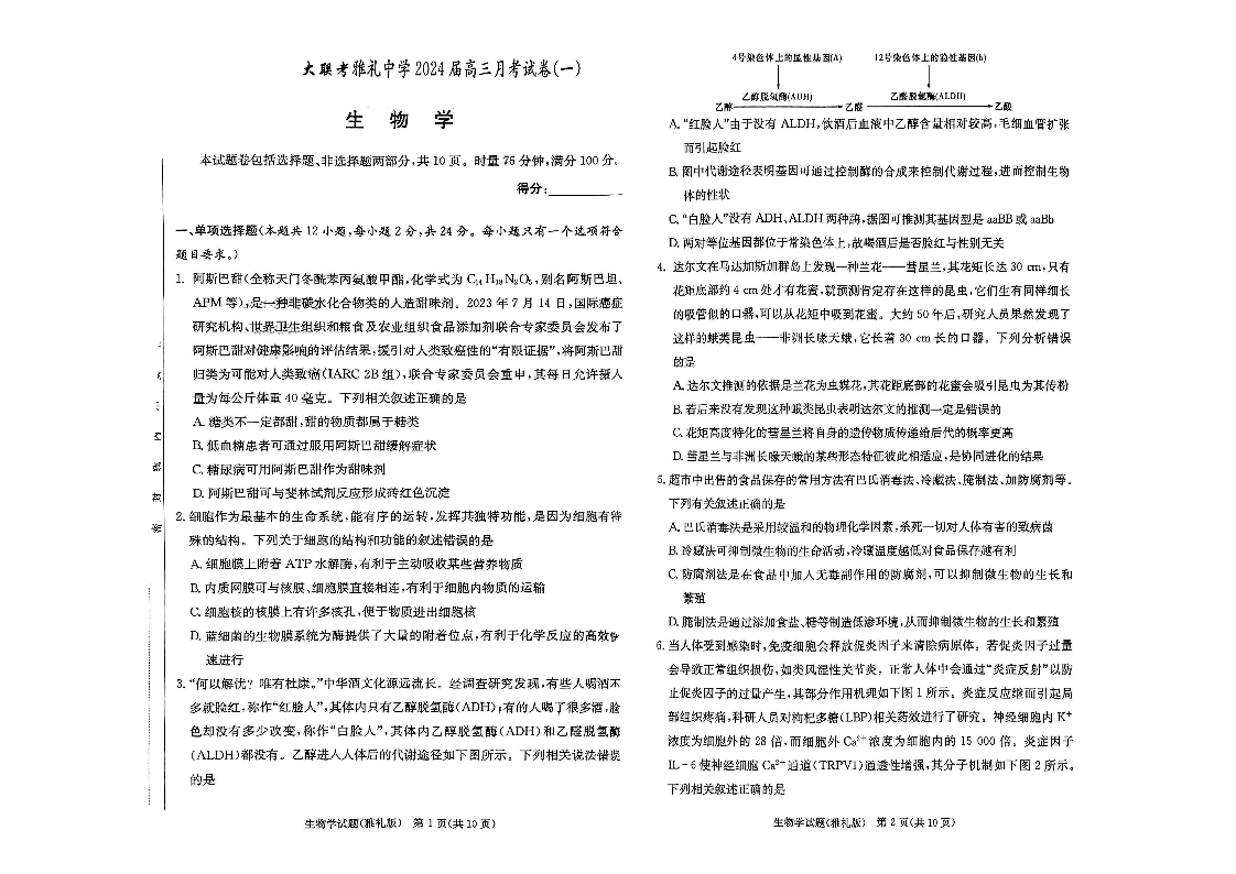 湖南省长沙市雅礼中学2024届高三上学期月考(一)生物