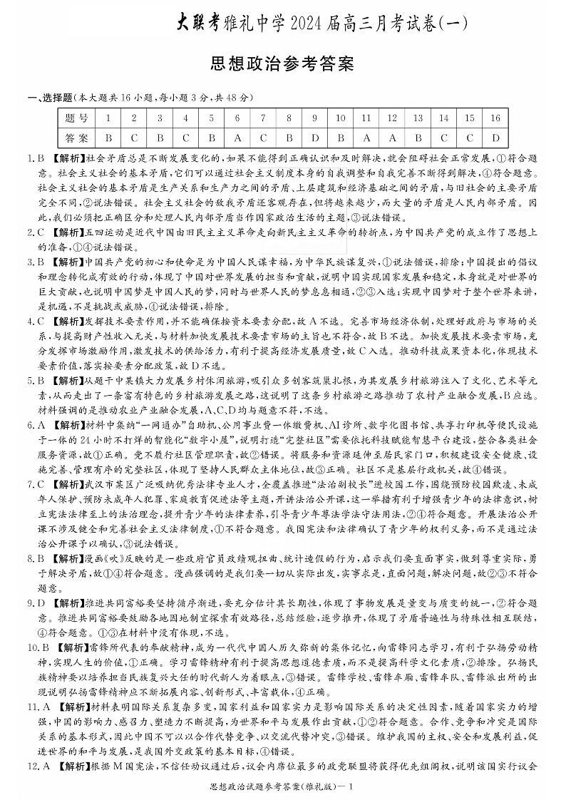 湖南省长沙市雅礼中学2024届高三上学期月考(一)政治答案