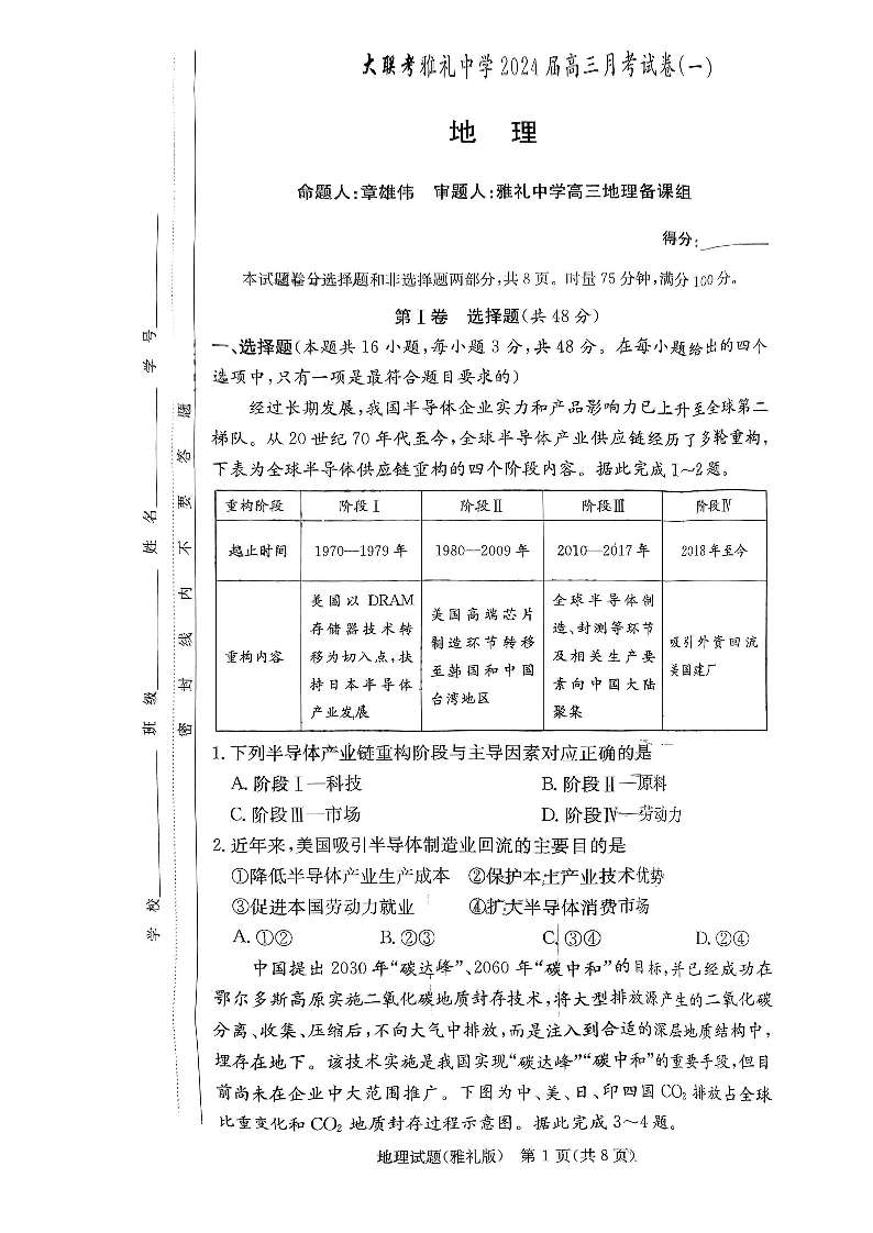 湖南省长沙市雅礼中学2024届高三上学期月考(一)地理