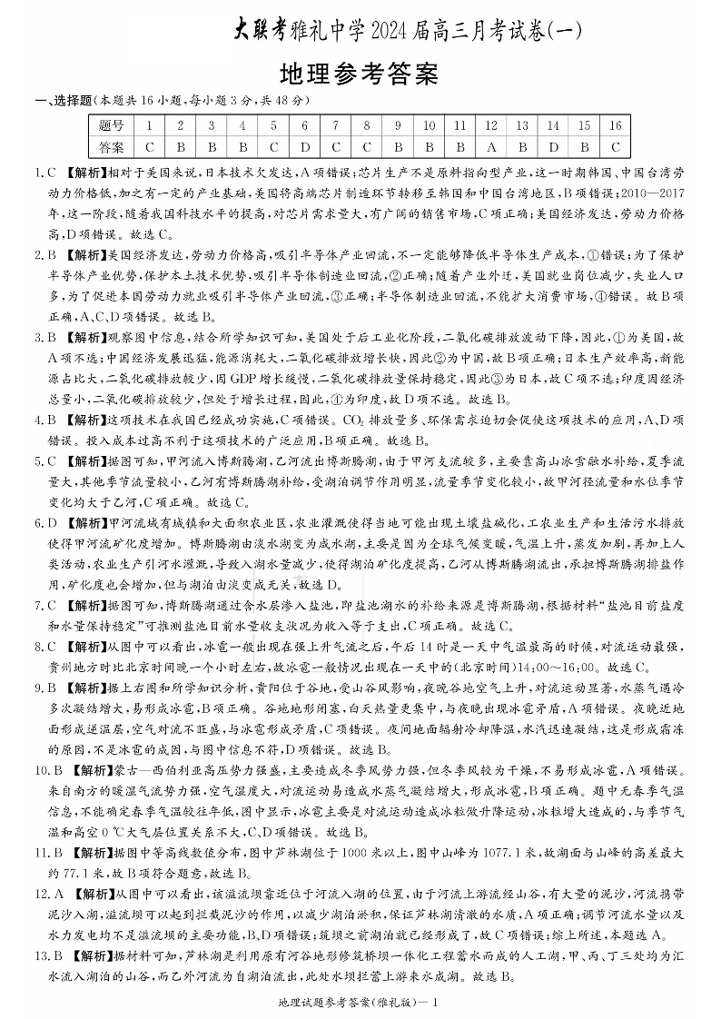 湖南省长沙市雅礼中学2024届高三上学期月考(一)地理答案