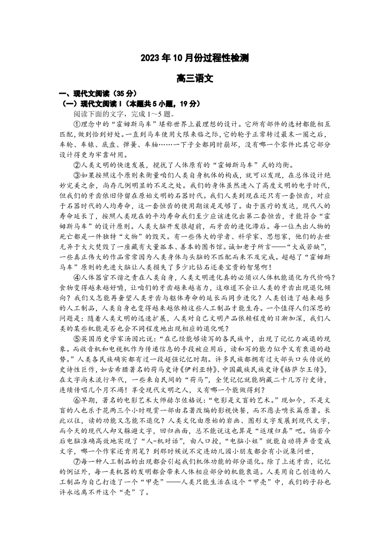 山东省潍坊市2024届高三上学期10月过程性检测语文