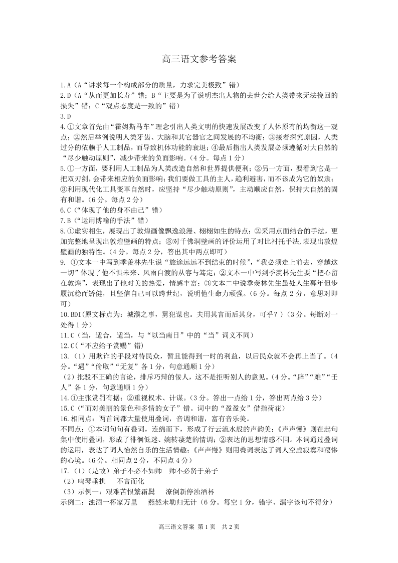 山东省潍坊市2024届高三上学期10月过程性检测语文答案