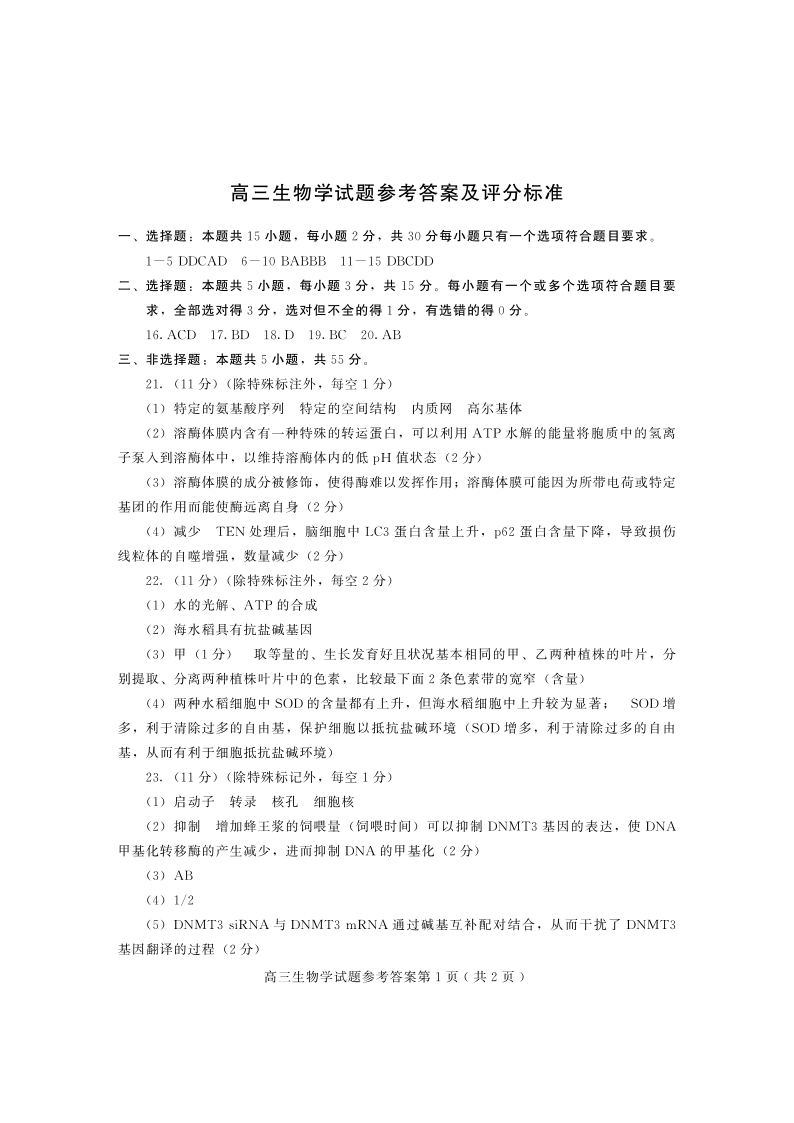 山东省潍坊市2024届高三上学期10月过程性检测生物答案