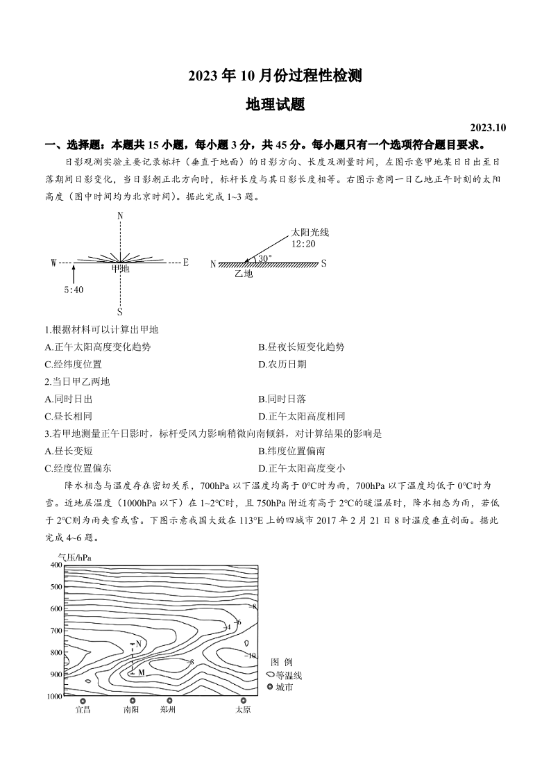 山东省潍坊市2024届高三上学期10月过程性检测地理