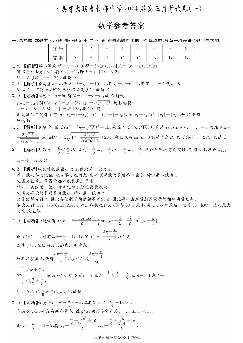 湖南省长沙市长郡中学2024届高三月考(一)数学答案