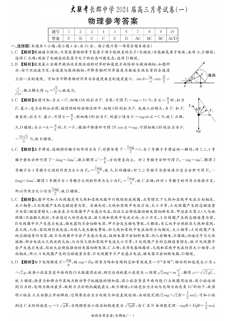湖南省长沙市长郡中学2024届高三月考(一)物理答案