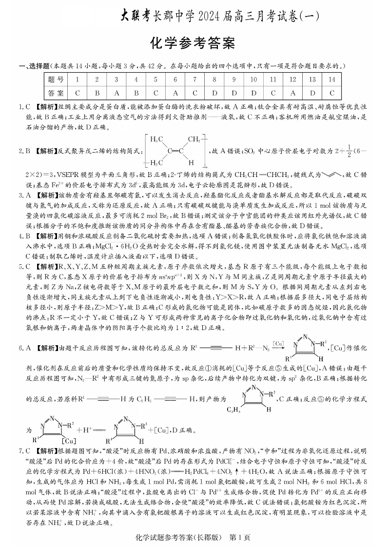 湖南省长沙市长郡中学2024届高三月考(一)化学答案