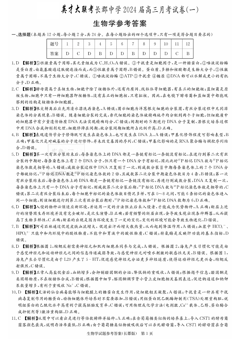 湖南省长沙市长郡中学2024届高三月考(一)生物答案