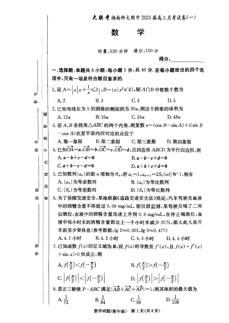 湖南师范大学附属中学2024届高三上学期月考(一)数学