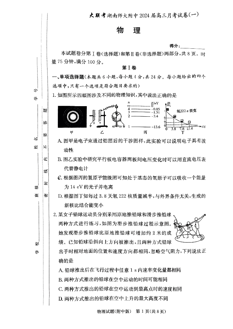 湖南师范大学附属中学2024届高三上学期月考(一)物理