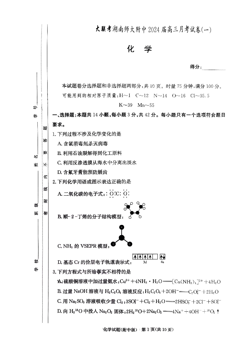 湖南师范大学附属中学2024届高三上学期月考(一)化学