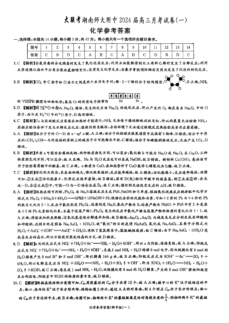 湖南师范大学附属中学2024届高三上学期月考(一)化学答案