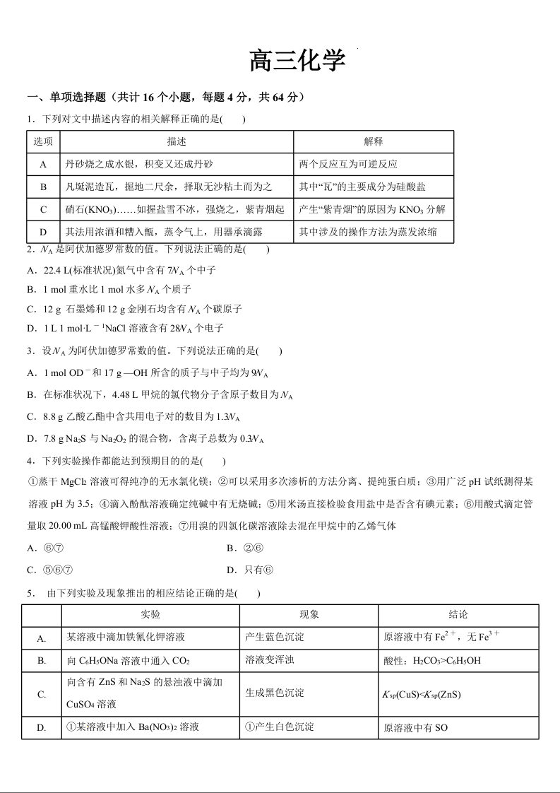 吉林省通化市梅河口市第五中学2024届高三上学期9月月考化学