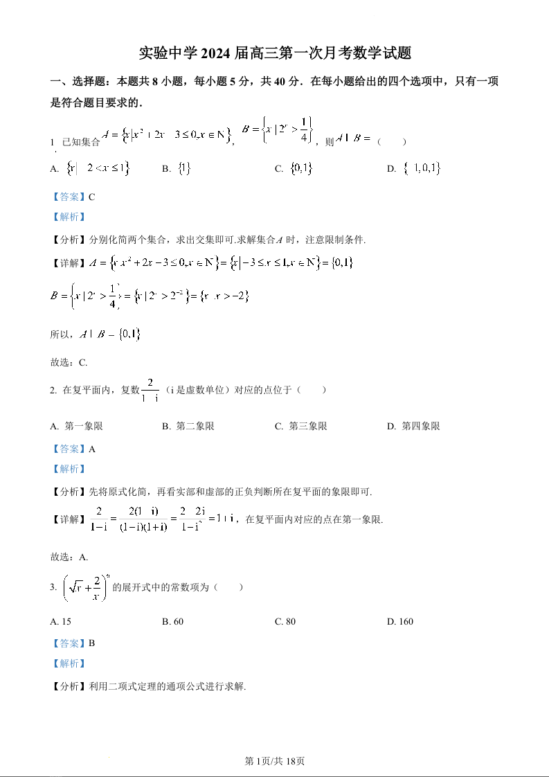 江苏省海安市实验中学2024届高三上学期10月月考数学(精品解析版)
