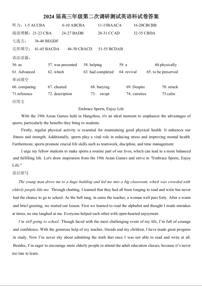 吉林省长春市第二中学2024届高三上学期10月月考英语答案