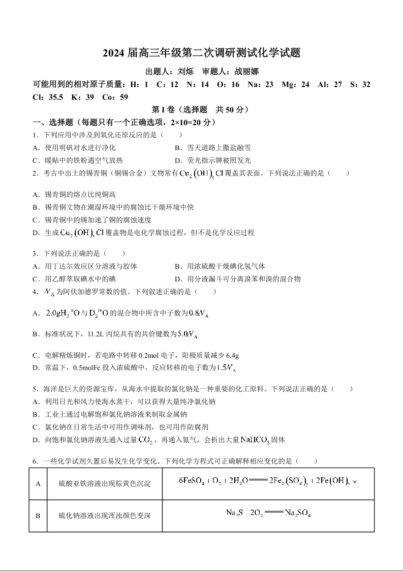 吉林省长春市第二中学2024届高三上学期10月月考化学+答案