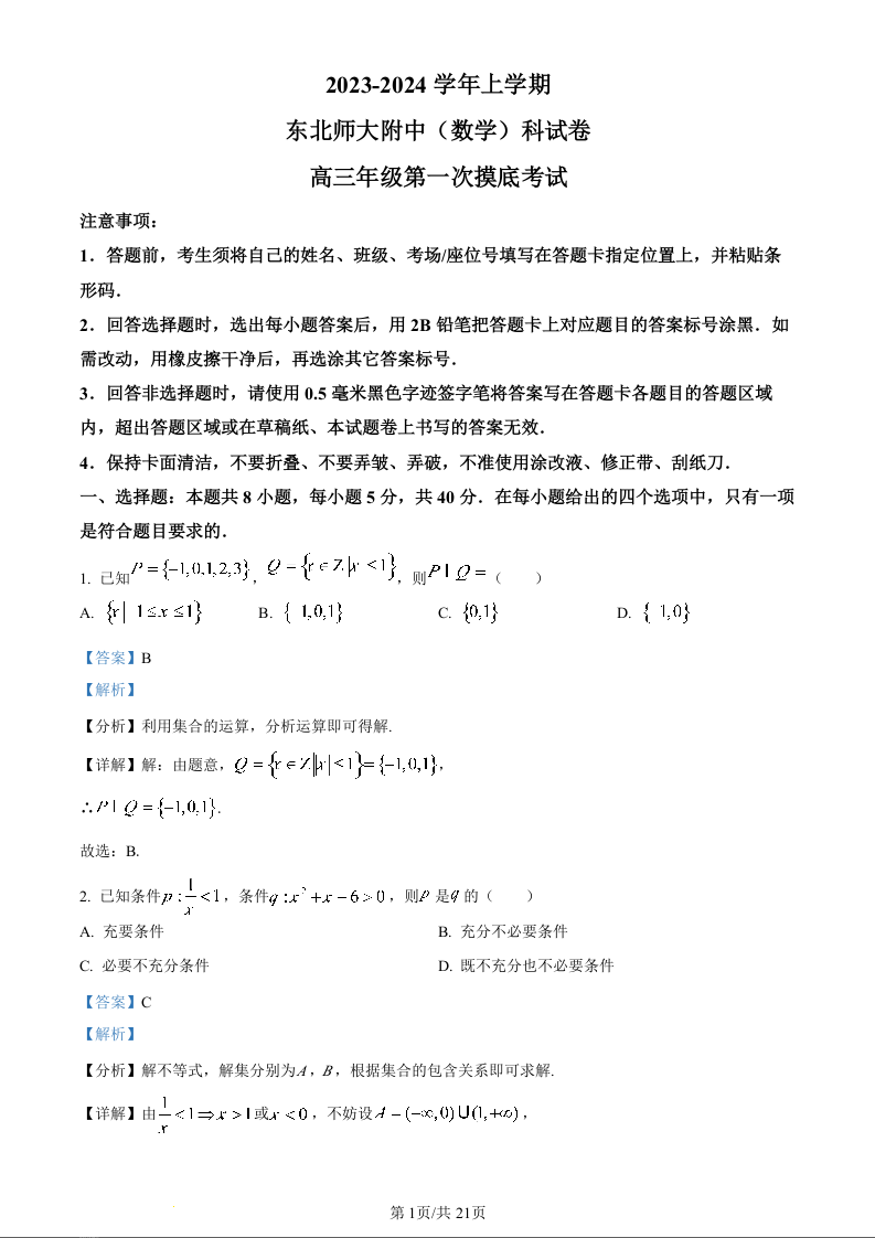 吉林省长春市东北师范大学附属中学2024届高三上学期9月数学(精品解析版)