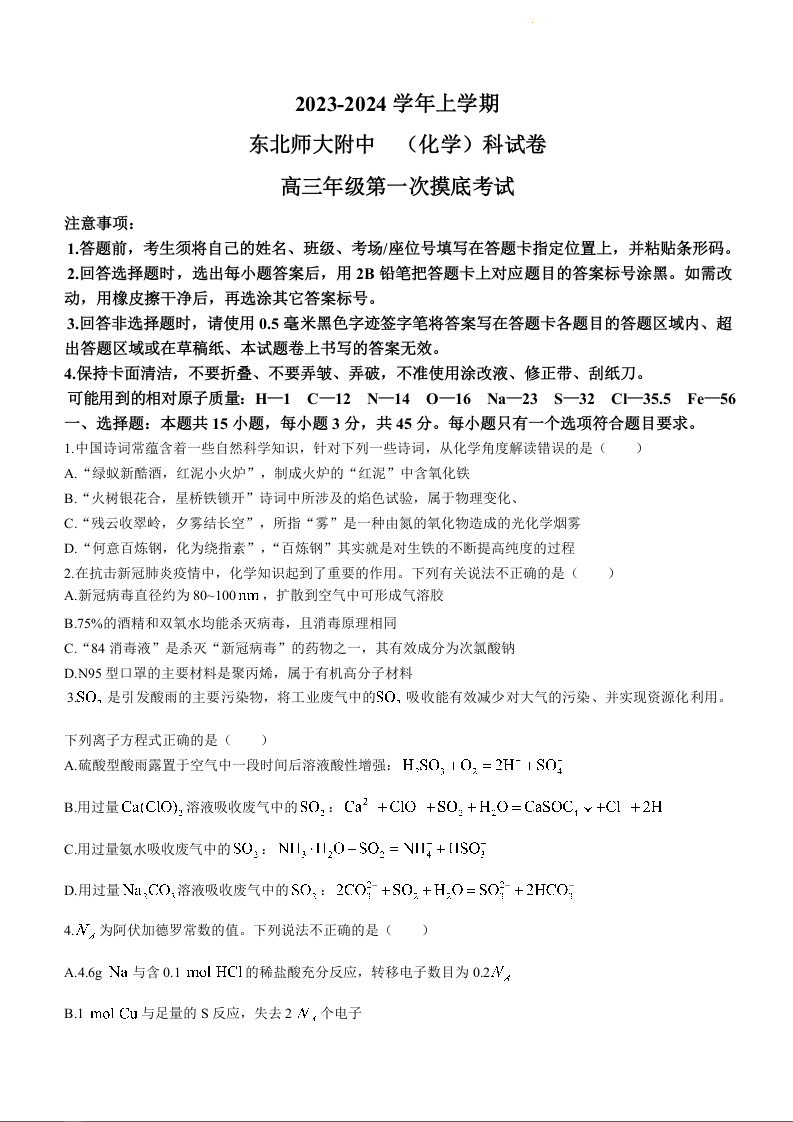 吉林省长春市东北师范大学附属中学2024届高三上学期9月化学