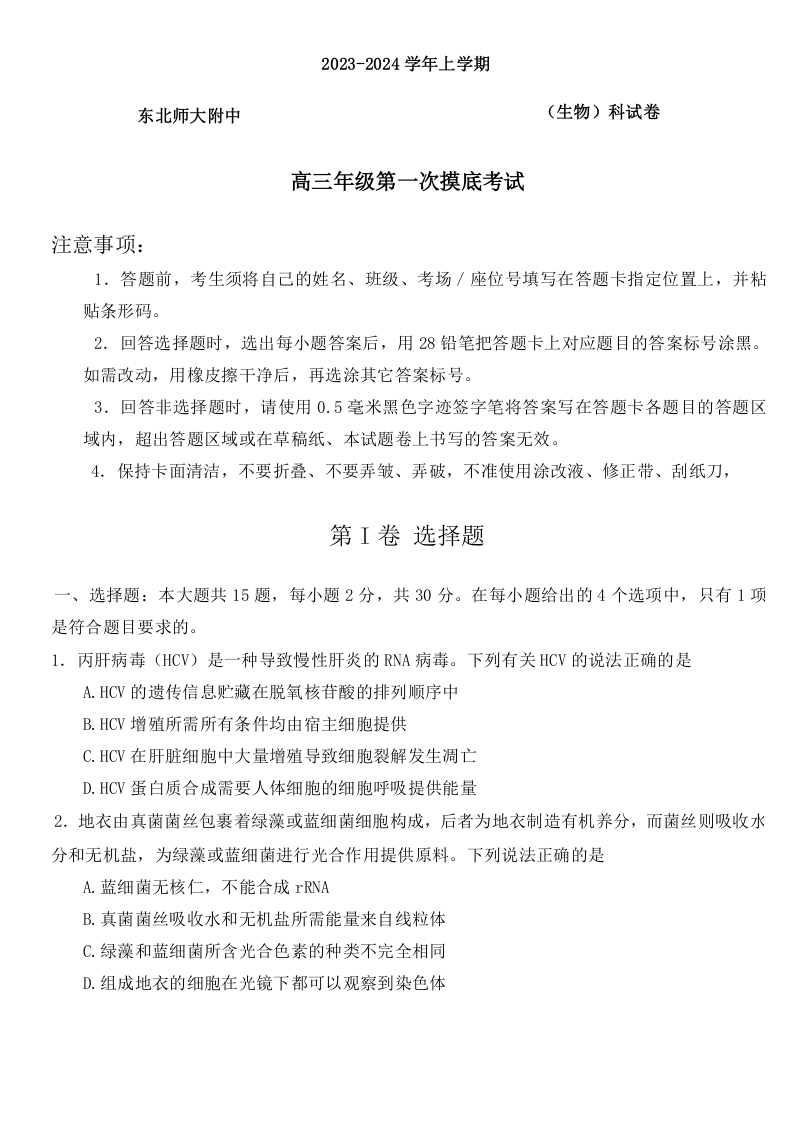 吉林省长春市东北师范大学附属中学2024届高三上学期9月生物