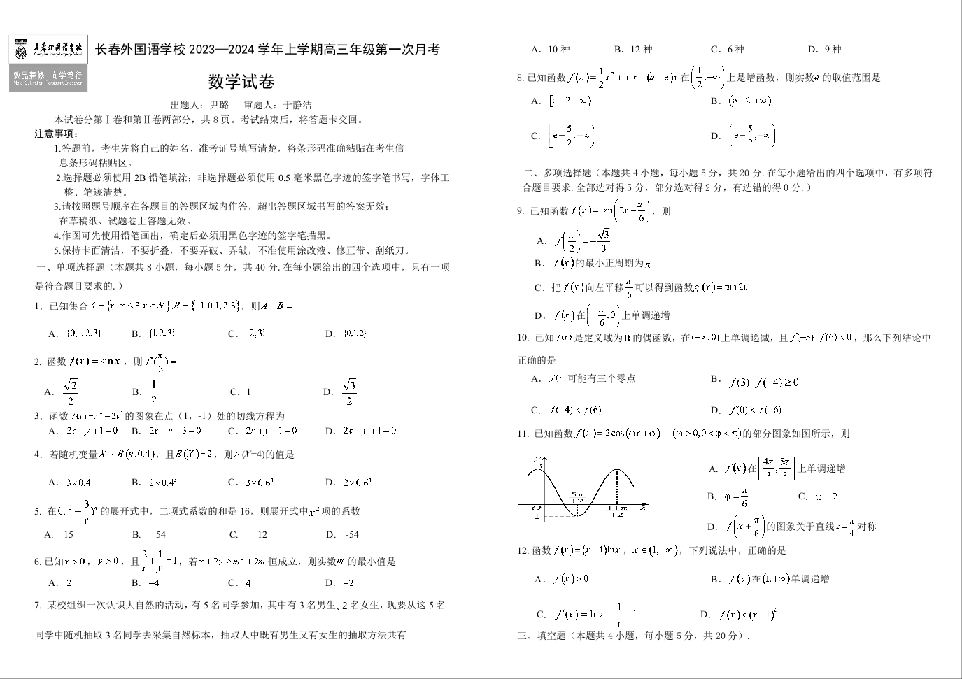 吉林省长春外国语学校2024届高三上学期9月月考数学+答案
