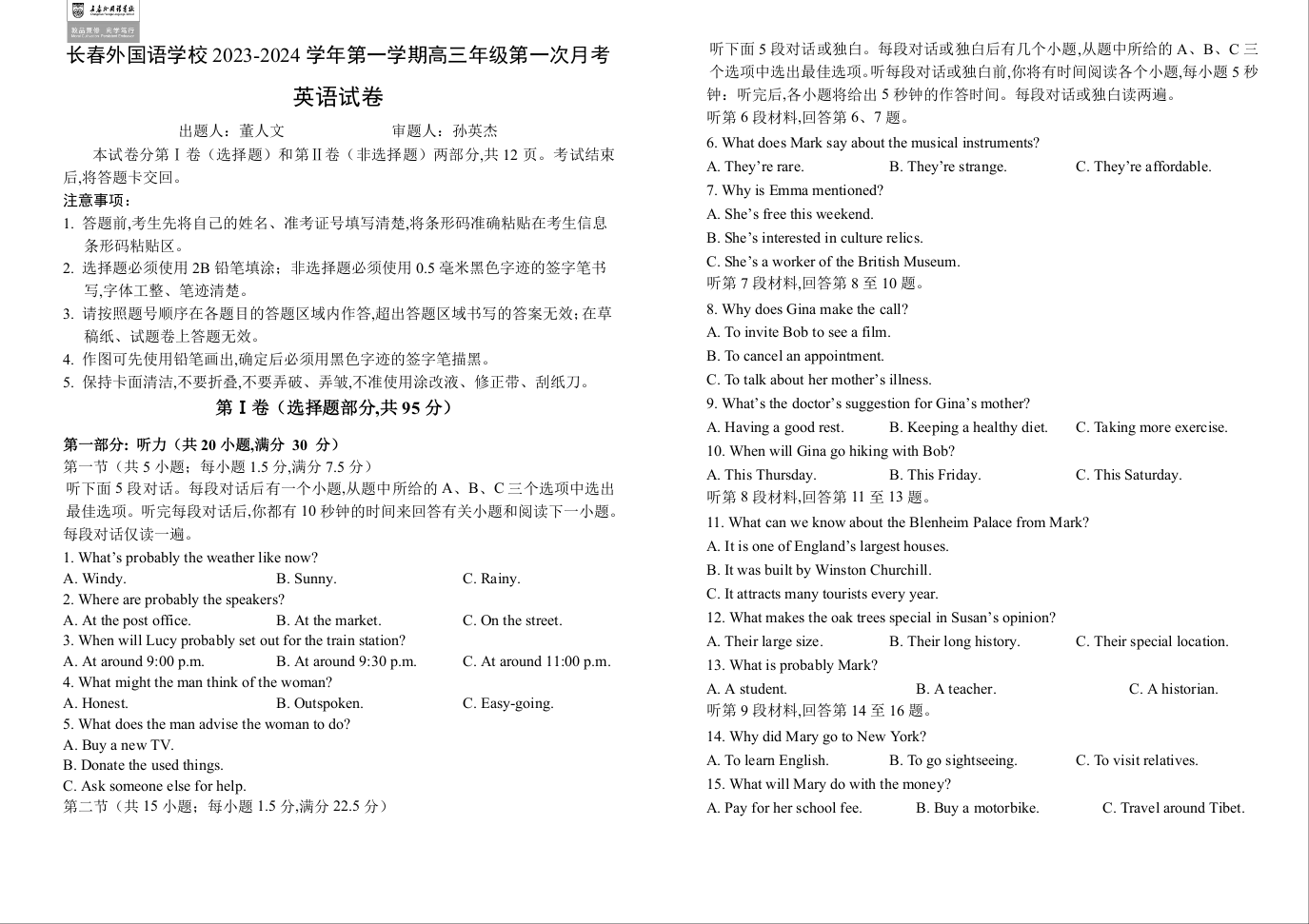 吉林省长春外国语学校2024届高三上学期9月月考英语+答案