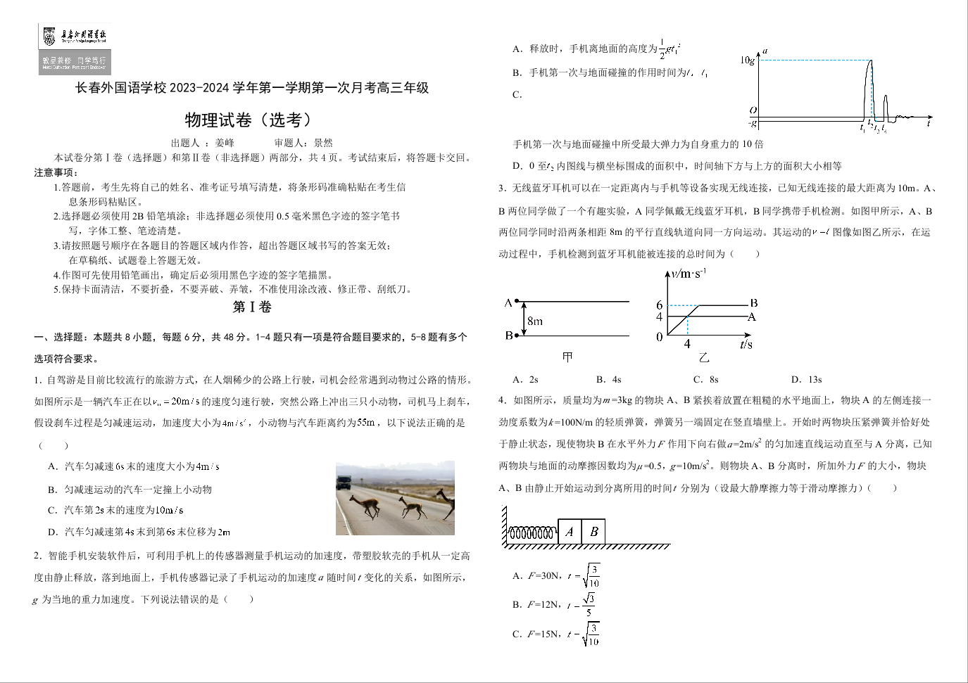 吉林省长春外国语学校2024届高三上学期9月月考物理+答案