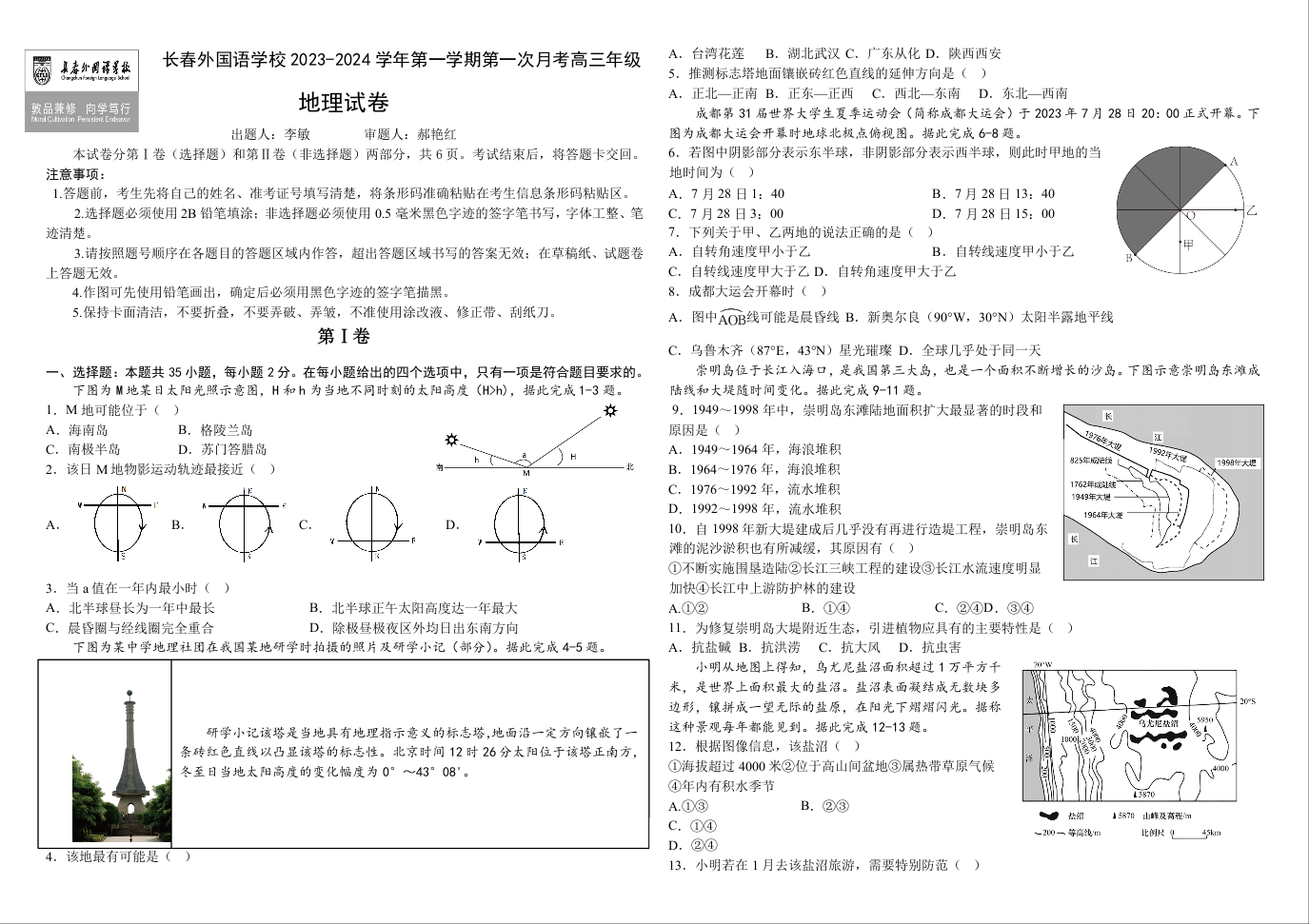 吉林省长春外国语学校2024届高三上学期9月月考地理+答案