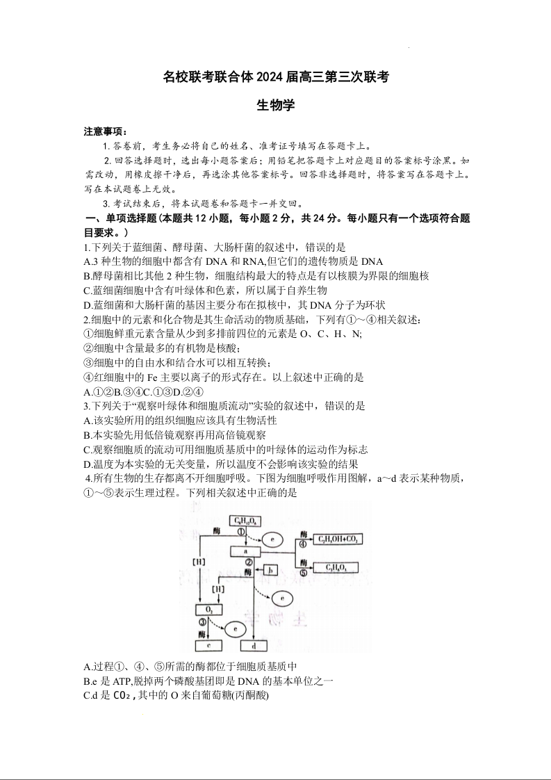 湖南炎德英才大联考名校联考联合体2024届高三第三次联考生物