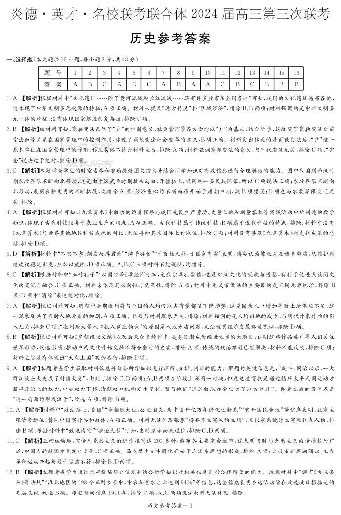 湖南炎德英才大联考名校联考联合体2024届高三第三次联考历史答案