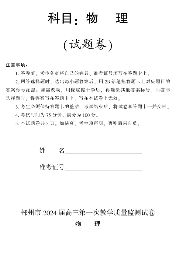 湖南省郴州市2024届高三上学期第一次教学质量监测试卷物理+答案