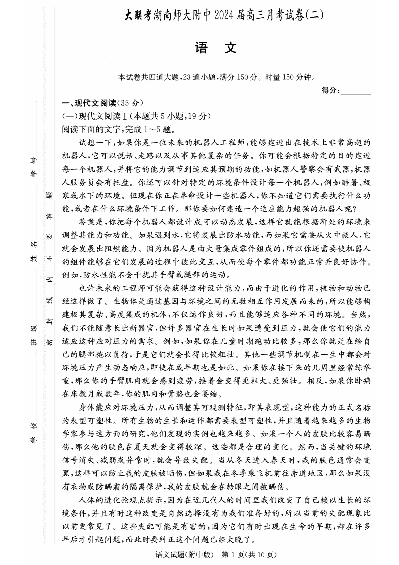 湖南师范大学附属中学2024届高三上学期月考(二)语文+答案