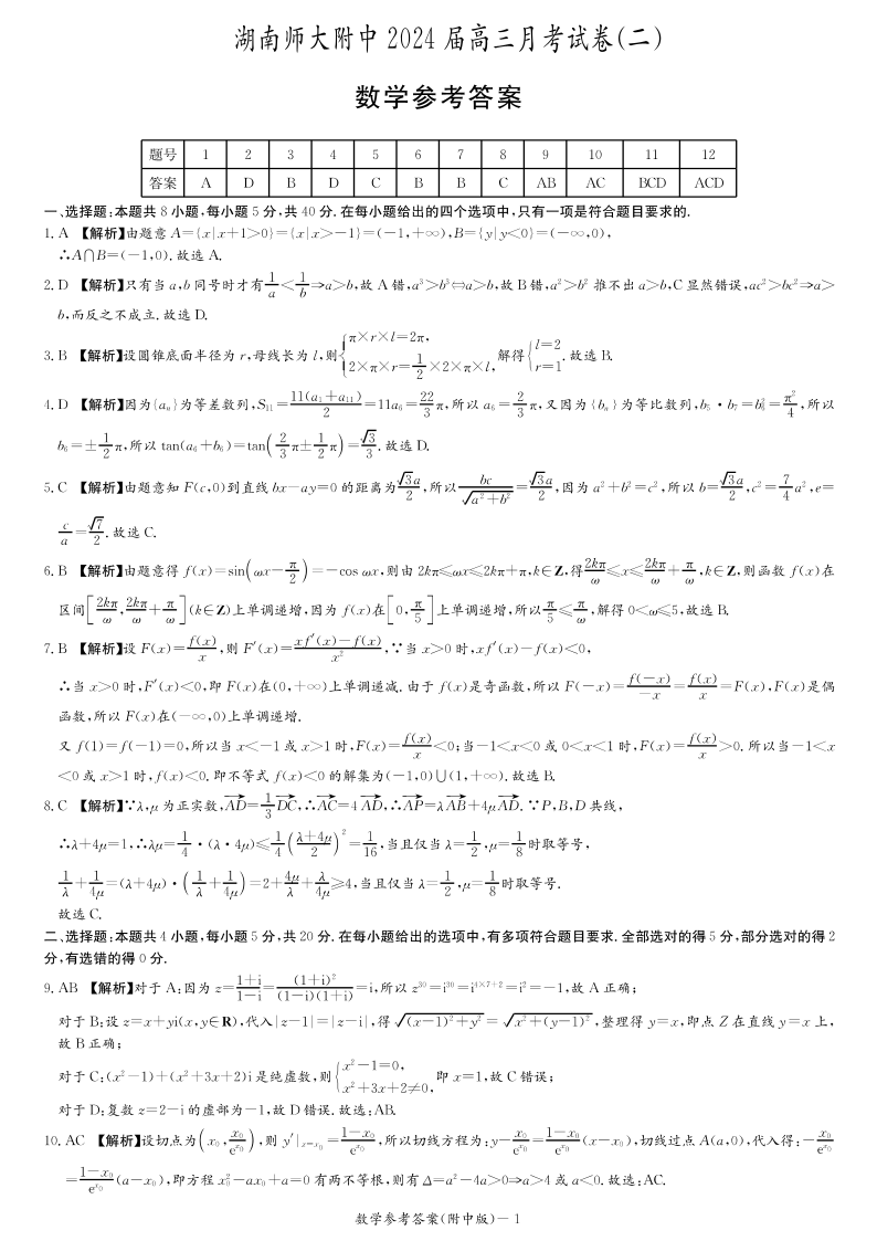 湖南师范大学附属中学2024届高三上学期月考(二)数学答案